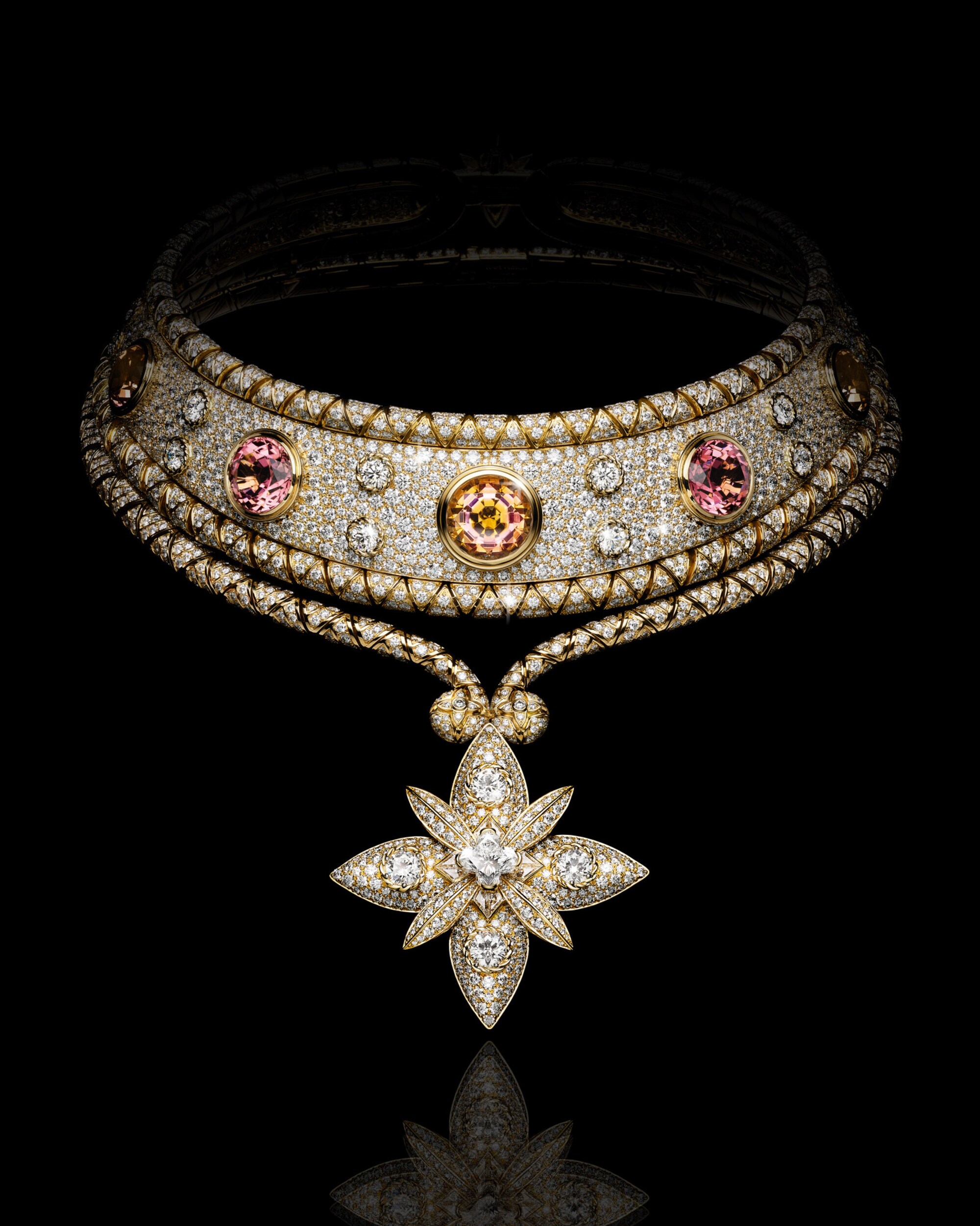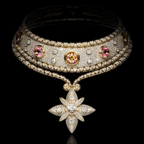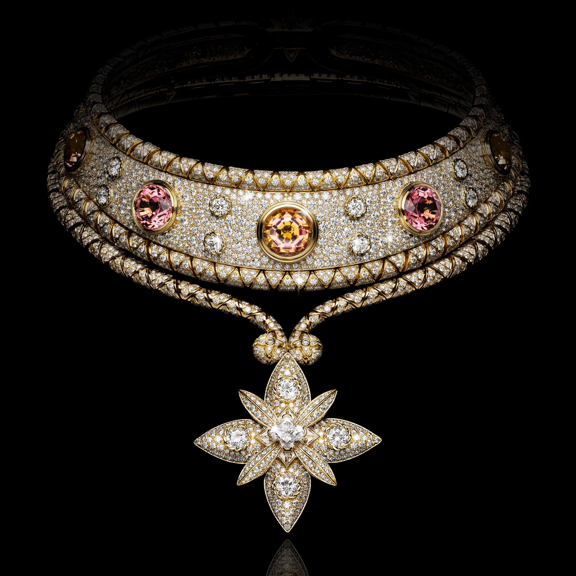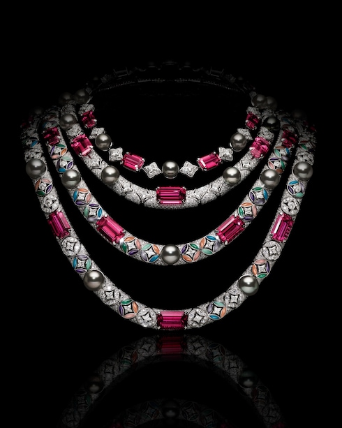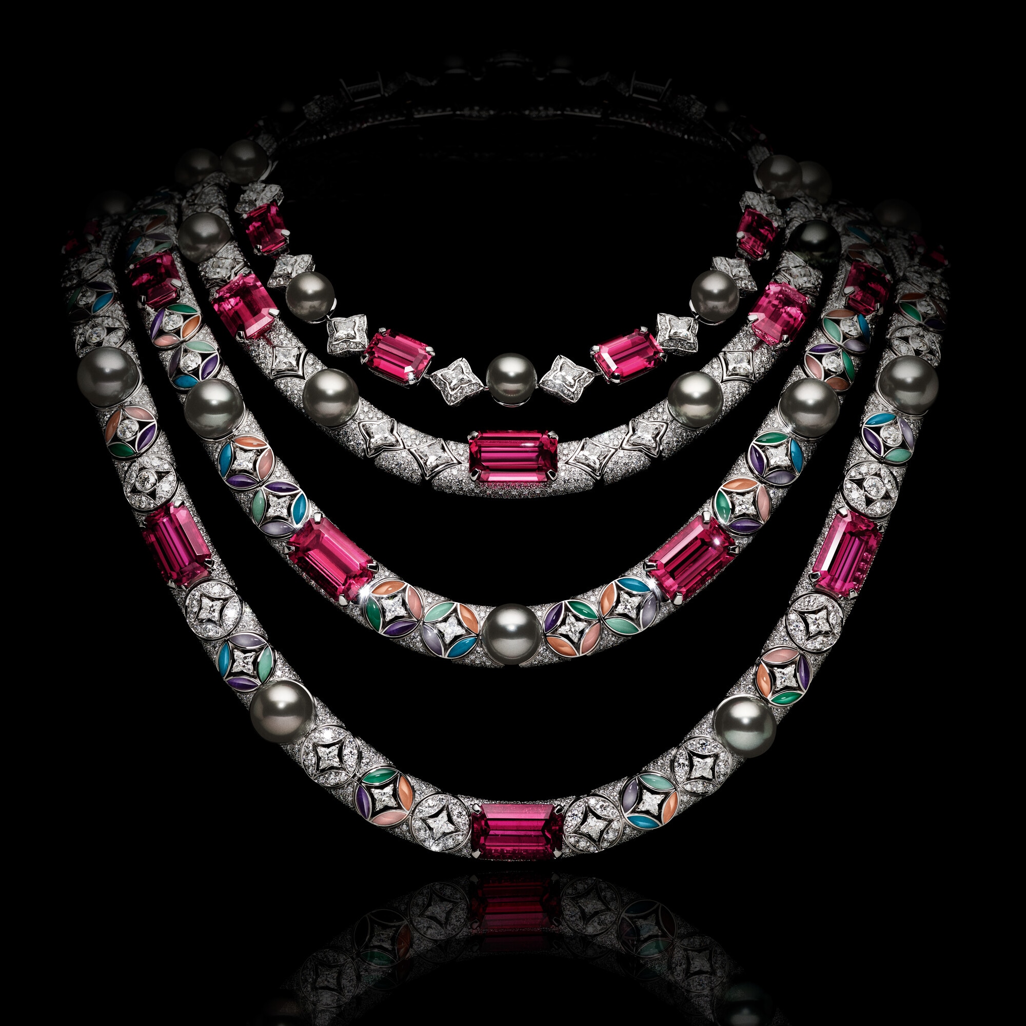 Florescence 主題讓創意盡情綻放,將靈感變成令人意想不到的可能性。Florescence 主題以大膽鮮明的風格重新演繹 Monogram Flower 花卉圖案和風箏圖案,令人想起品牌的特色元素。藍碧璽和紅碧璽形成和諧對比,各種色彩和形狀互相交輝,高貴優雅,令人驚豔。珠寶合共鑲嵌 12 顆藍碧璽(共重 174.63 克拉)和 20 顆紅碧璽(共重 164.18 克拉),配以靈活的可拆式設計,成為動感和蛻變的象徵。