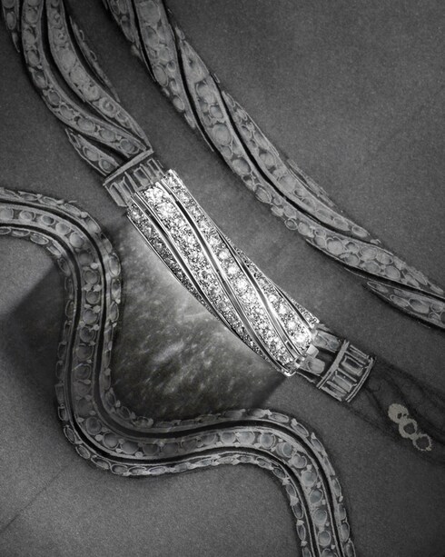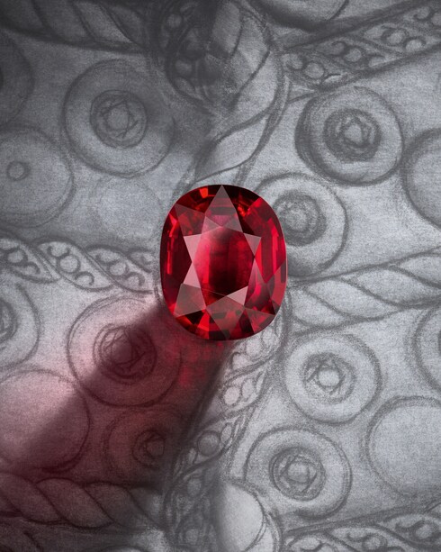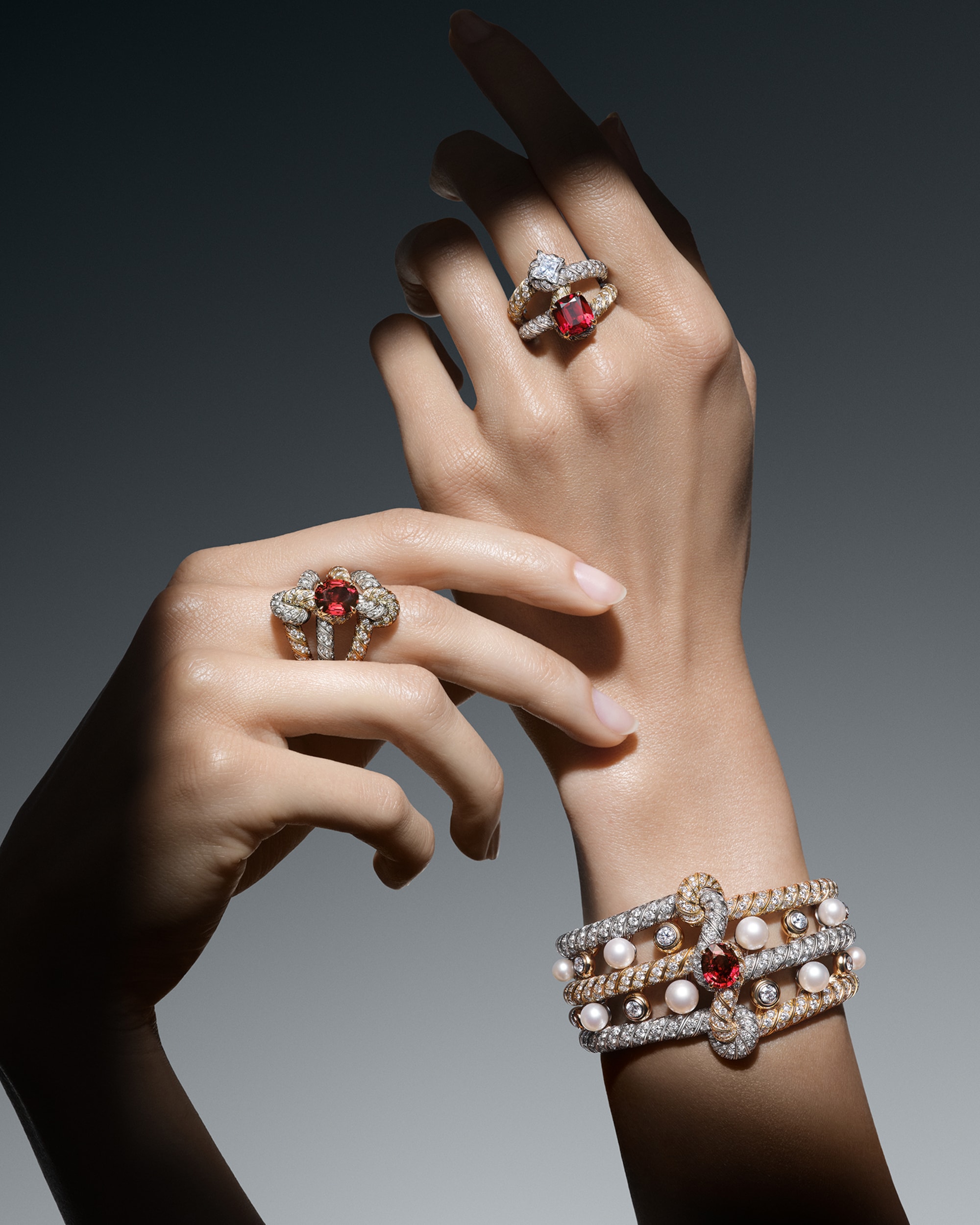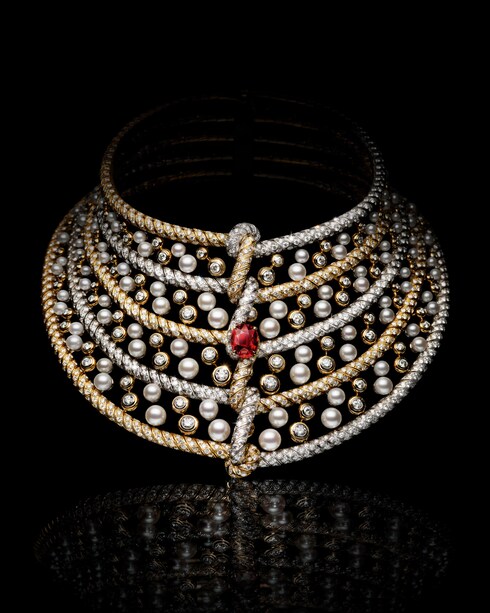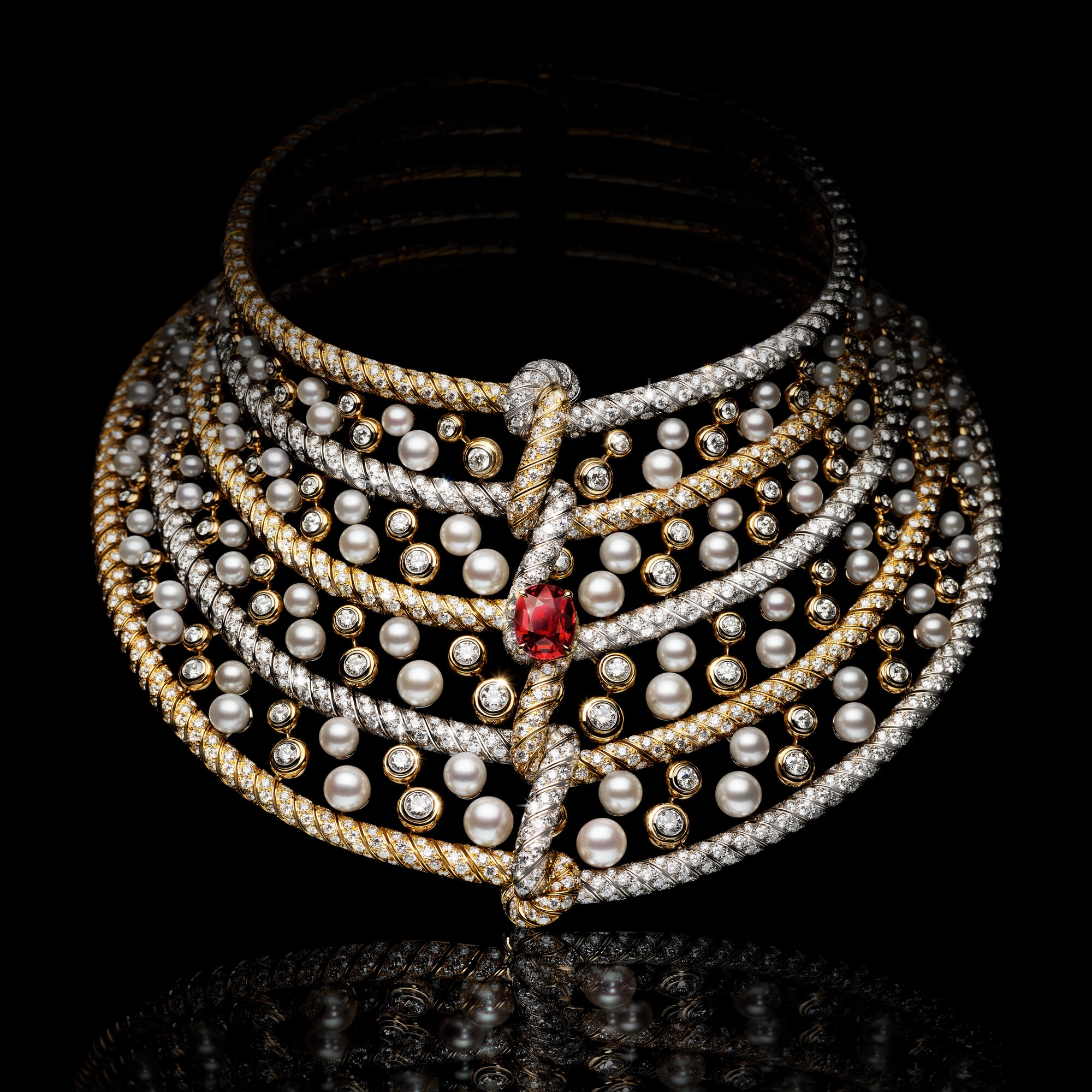 Connection 主題象徵通往無限創意的大門,將手製工藝變成實現無窮想像及大膽設計的途徑。一條瑰麗不凡的項鏈以五排鑽石和珍珠繩索交織而成,並鑲嵌一顆濃豔的6.04克拉鴿血紅紅寶石,體現精湛工藝與出眾創意的完美結合,以匠心技藝開創無限可能性。