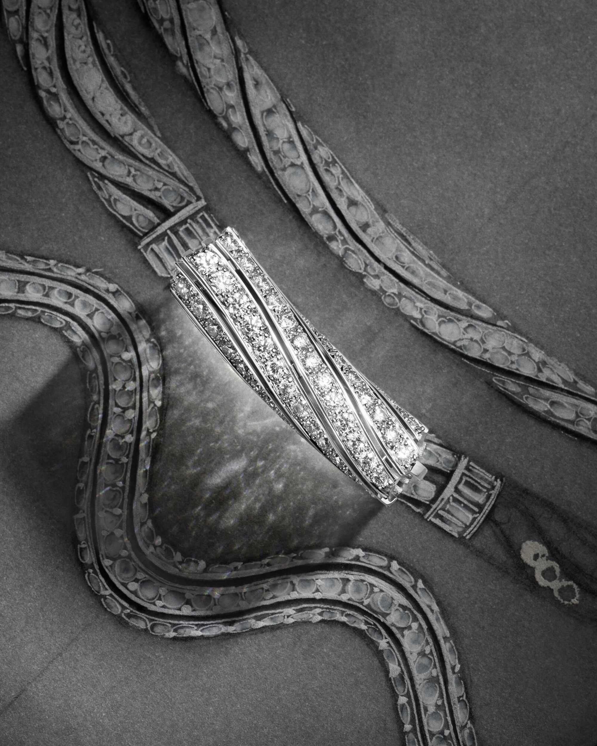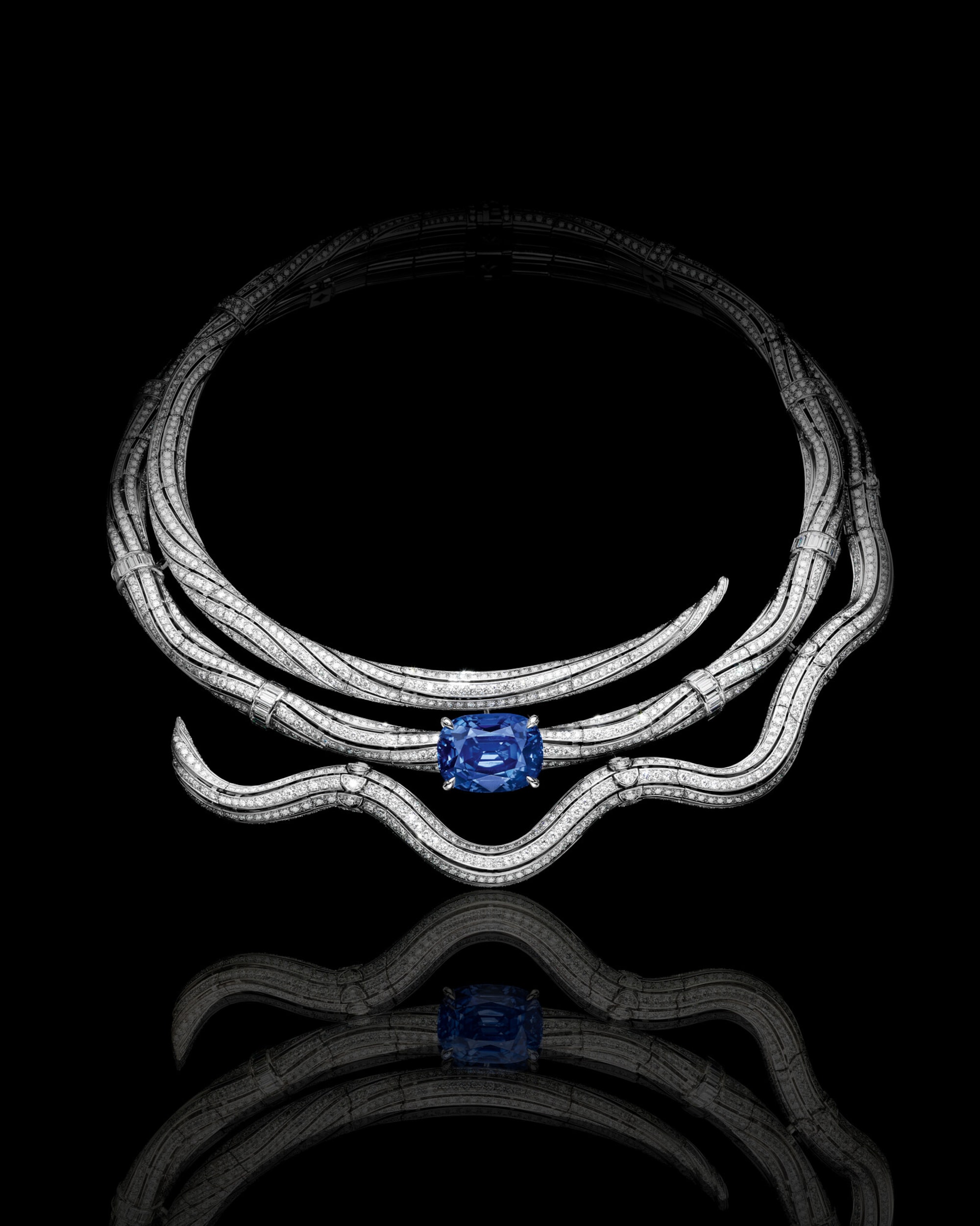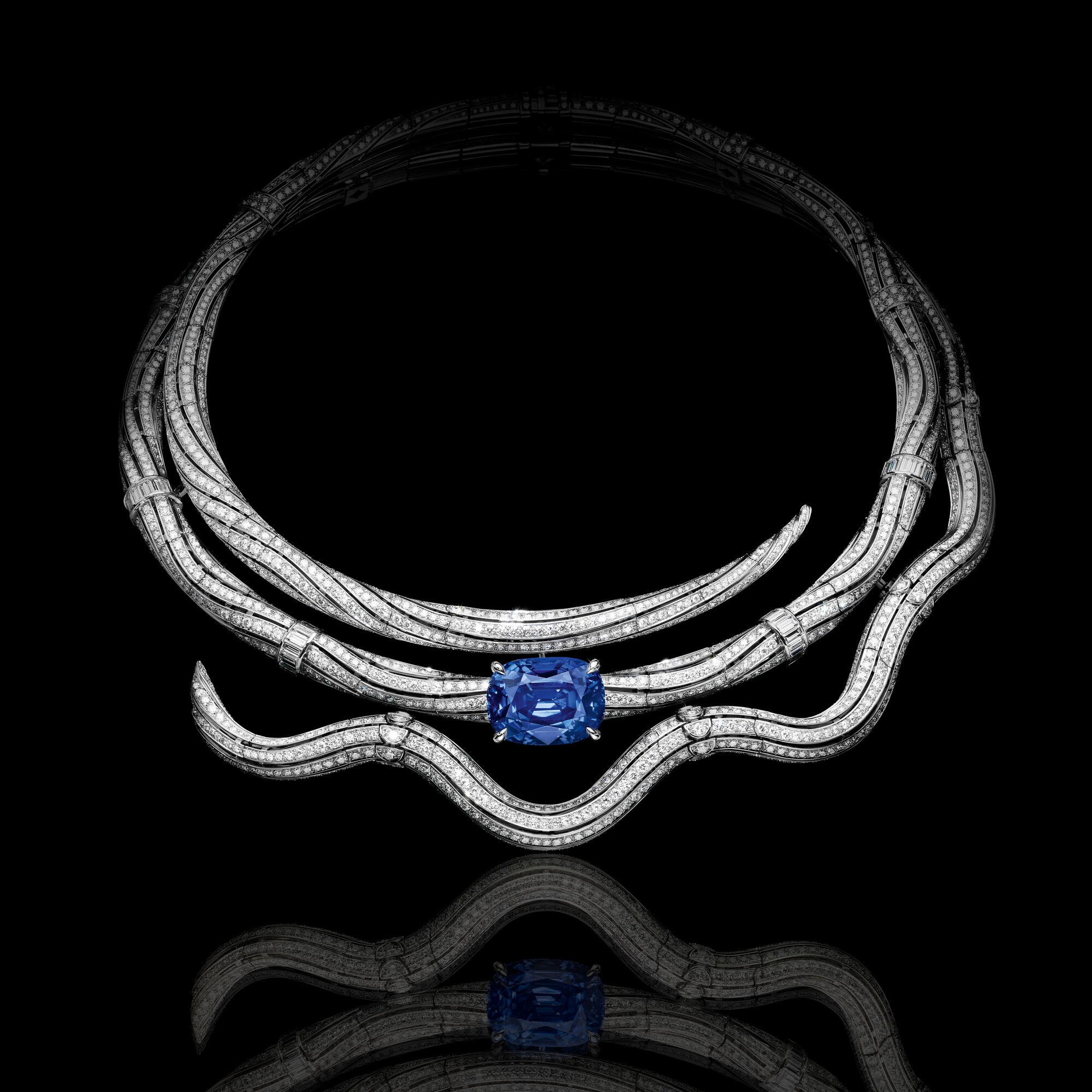 Motion 主題捕捉自由流動的創意,並沿途汲取各種靈感。一顆瑰麗的 35.69 克拉藍寶石鑲嵌於一排優美的鑽石之上,象徵澎湃的創新力量。懾人的珠寶設計為動感賦予意義,標誌著大膽創作的重要一步。