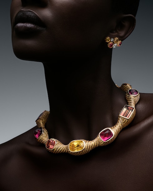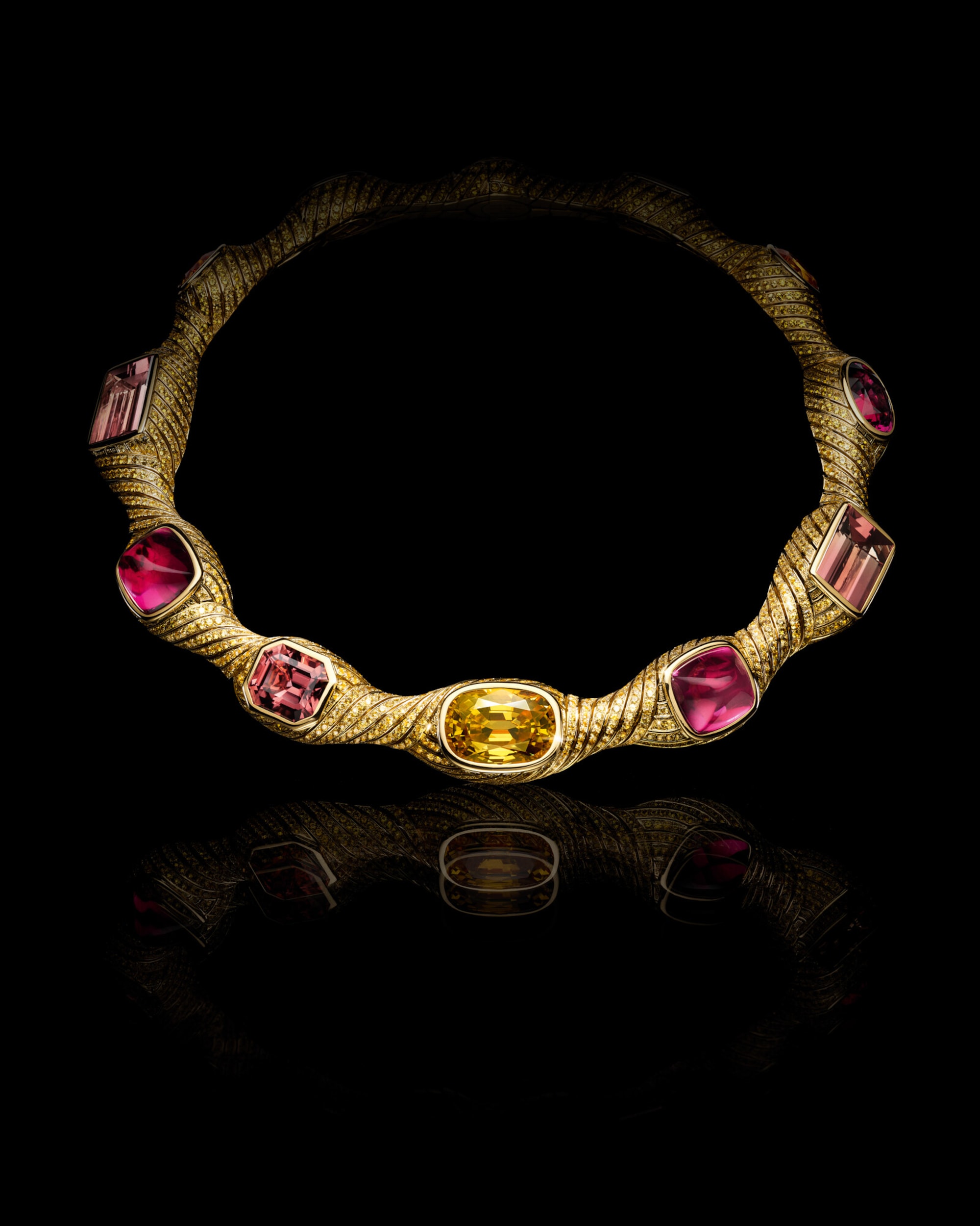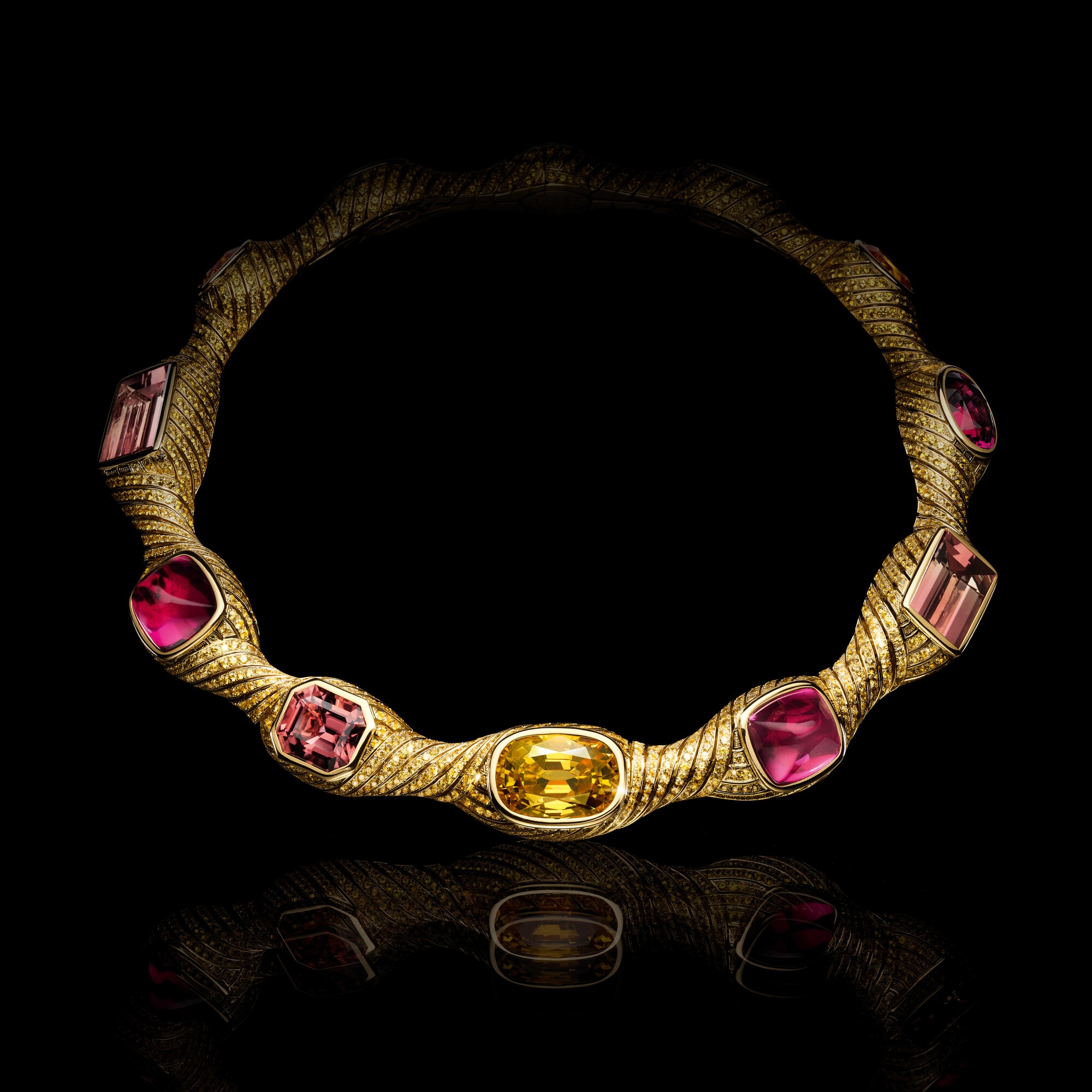 Joy 主題綻放絢麗色彩,象徵豐饒與歡欣。創意轉化為澎湃的色彩浪潮,多條迴旋的黃金繩索圍繞重逾 40 克拉的絢麗藍寶石和 2 0多克拉的碧璽,共重 204.63 克拉的寶石呈現琳琅滿目的形狀和切割,刻劃充滿動感的輪廓,頌揚大膽創作的自由和喜悅。