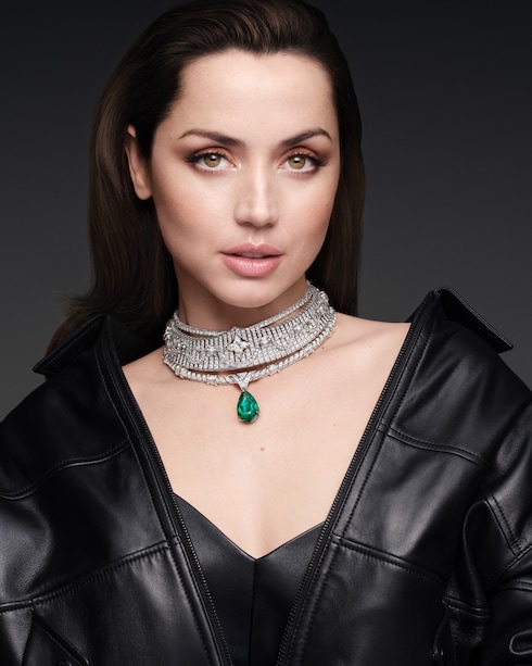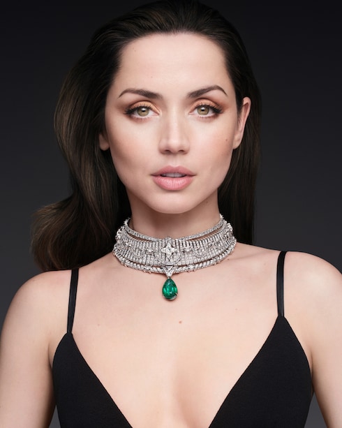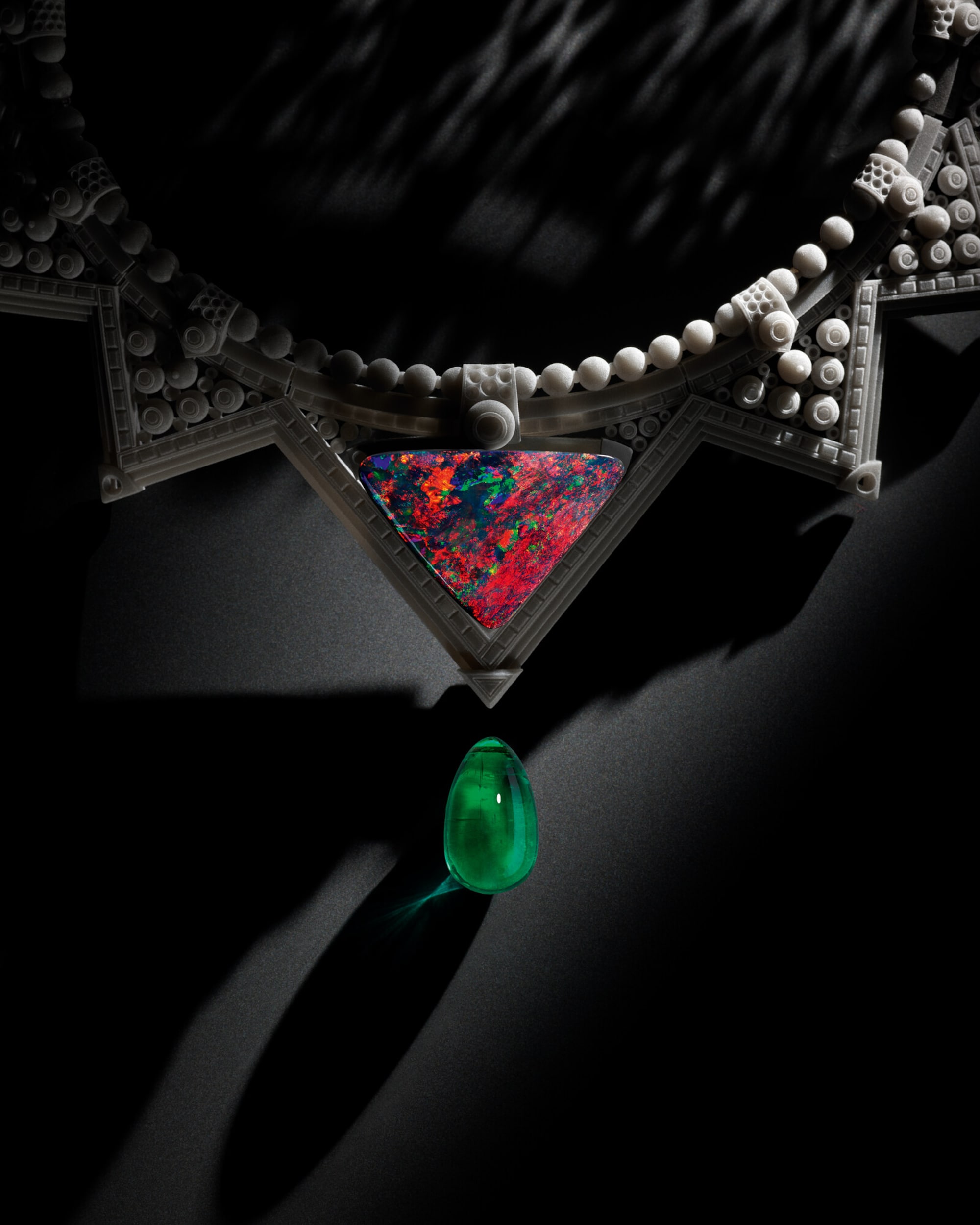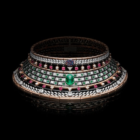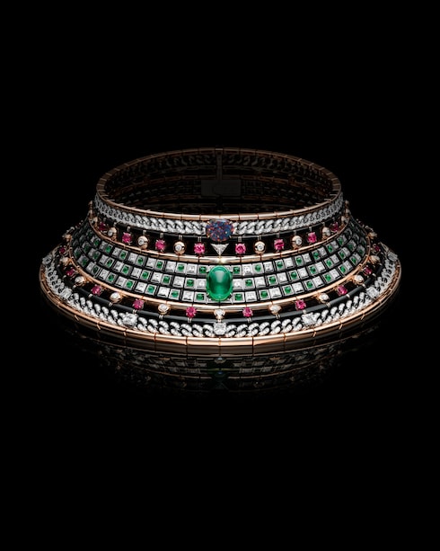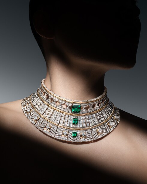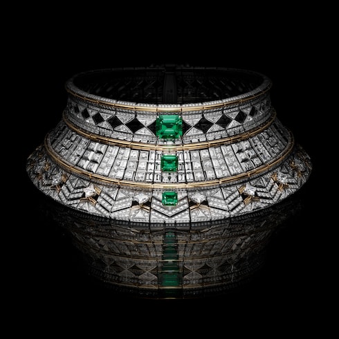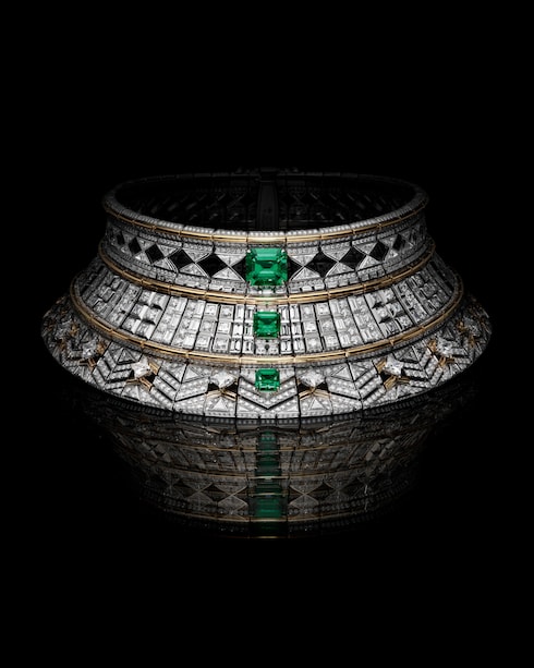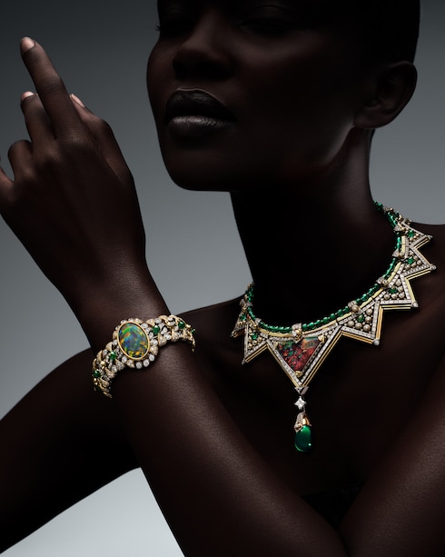 Monumental 主題刻劃學徒磨練技藝和成為大師的精彩旅程,並透過璀璨絢麗的珠寶象徵力求卓越和精準的精神。一顆重達 12.84 克拉的贊比亞祖母綠配以由 320 顆祖母綠、鑽石、紅寶石和縞瑪瑙交織而成的精緻 Damier 格紋上,巧妙反映以石頭逐一構建宏偉建築所需的無比耐性。