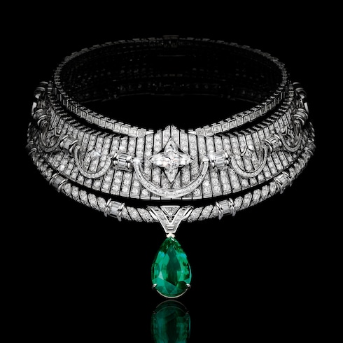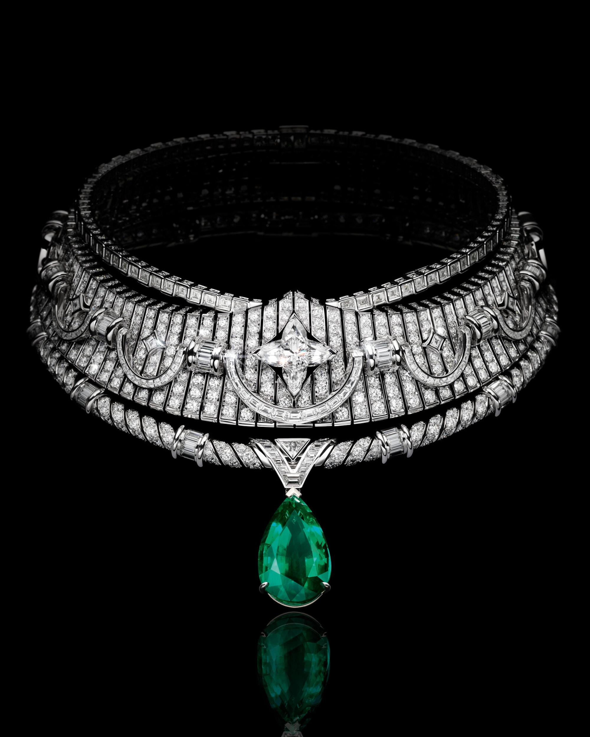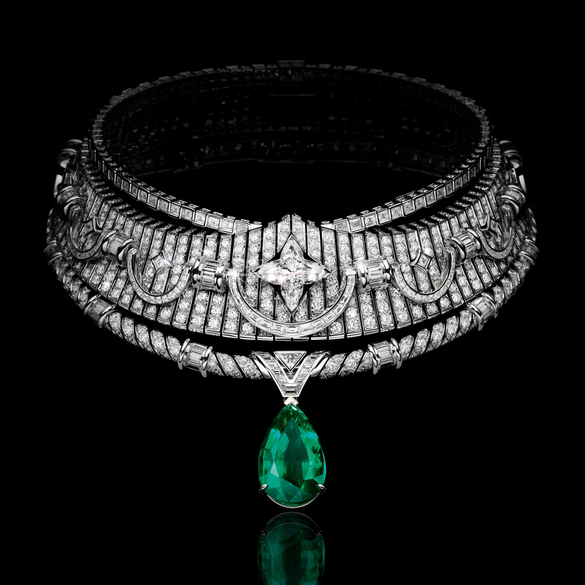 Apogée 主題透過匠心技藝與細膩情感的結合,展示登峰造極之美。此主題的矚目焦點為一條令人驚豔的項鏈,設計鑲嵌一顆稀世難求的 30.75 克拉巴西水滴形祖母綠及一顆珍罕的 10.56 克拉 D 色無瑕 LV Monogram Star 切割美鑽,象徵臻美無瑕。仔細連接的手挽細節令人想起品牌行李箱實用優雅的設計,而繩索細節則展示嫵媚優雅、堅毅果敢與精巧工藝的完美平衡。
