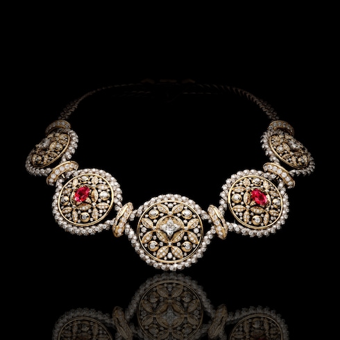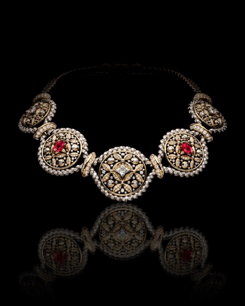 Protection 主題透過堅固而精巧的盾形圖案,以及明亮奪目的紅寶石、鑽石和珍珠,象徵用心守護匠人智慧。簡約唯美的圓形設計象徵世代守護知識的承諾,將優雅韻味與象徵性力量融入美態不朽的珠寶之中,詮釋珍貴知識需要用心守護的主題。
