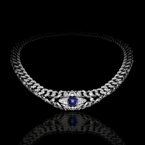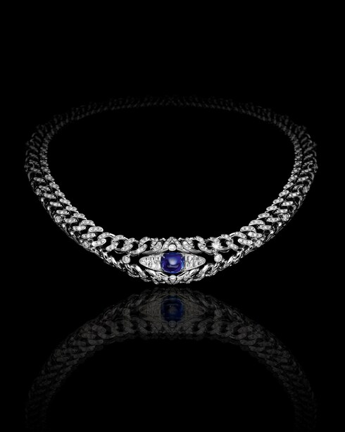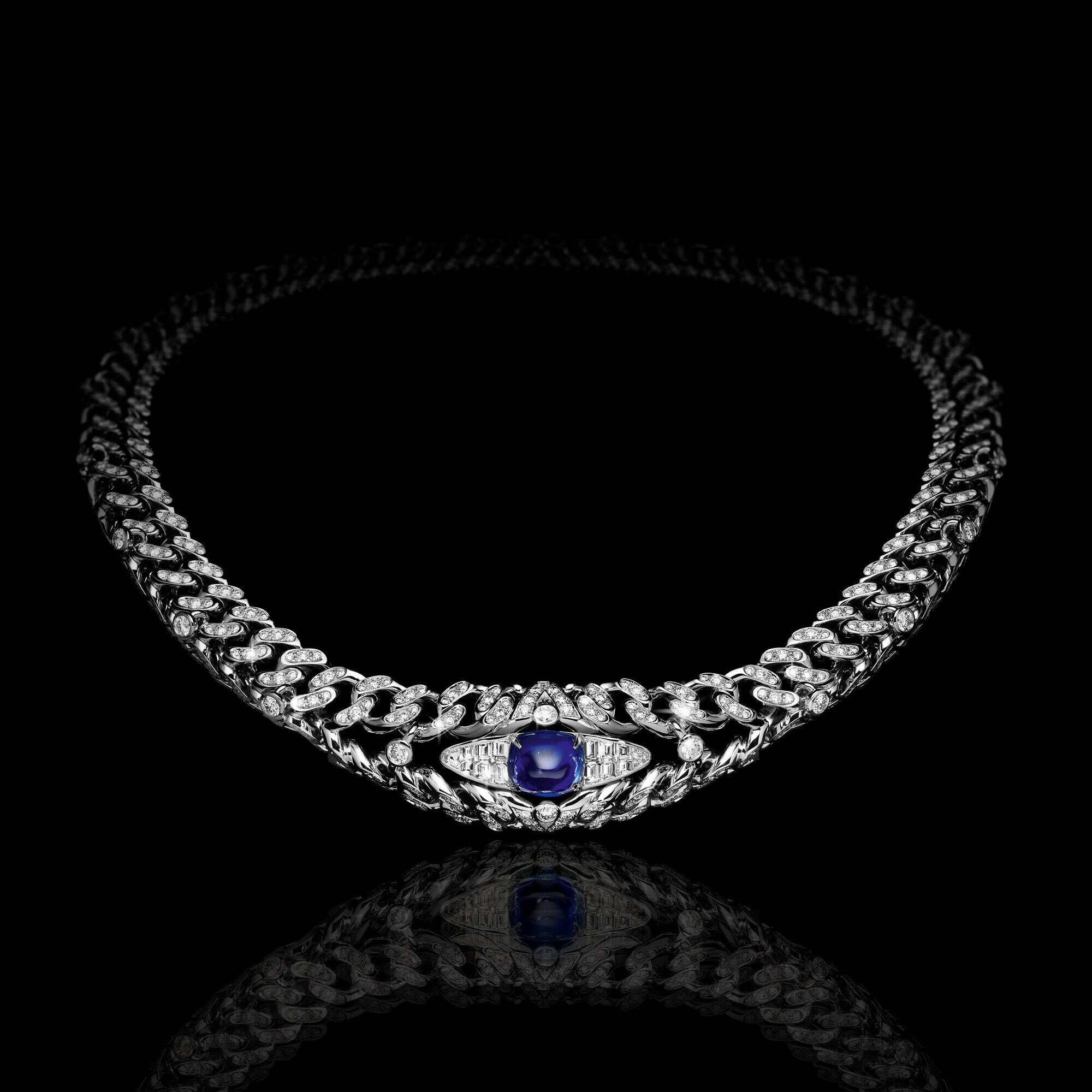 Keeper 主題以全知全視的眼睛圖案,守護和帶領這趟守護智慧的旅程。這套懾人的精緻珠寶包括一條中性的 10.12 克拉斯里蘭卡藍色藍寶石項鏈,並以標誌性的V形鑲鑽三角形和源自行李箱的細節點綴,令人嘆為觀止。